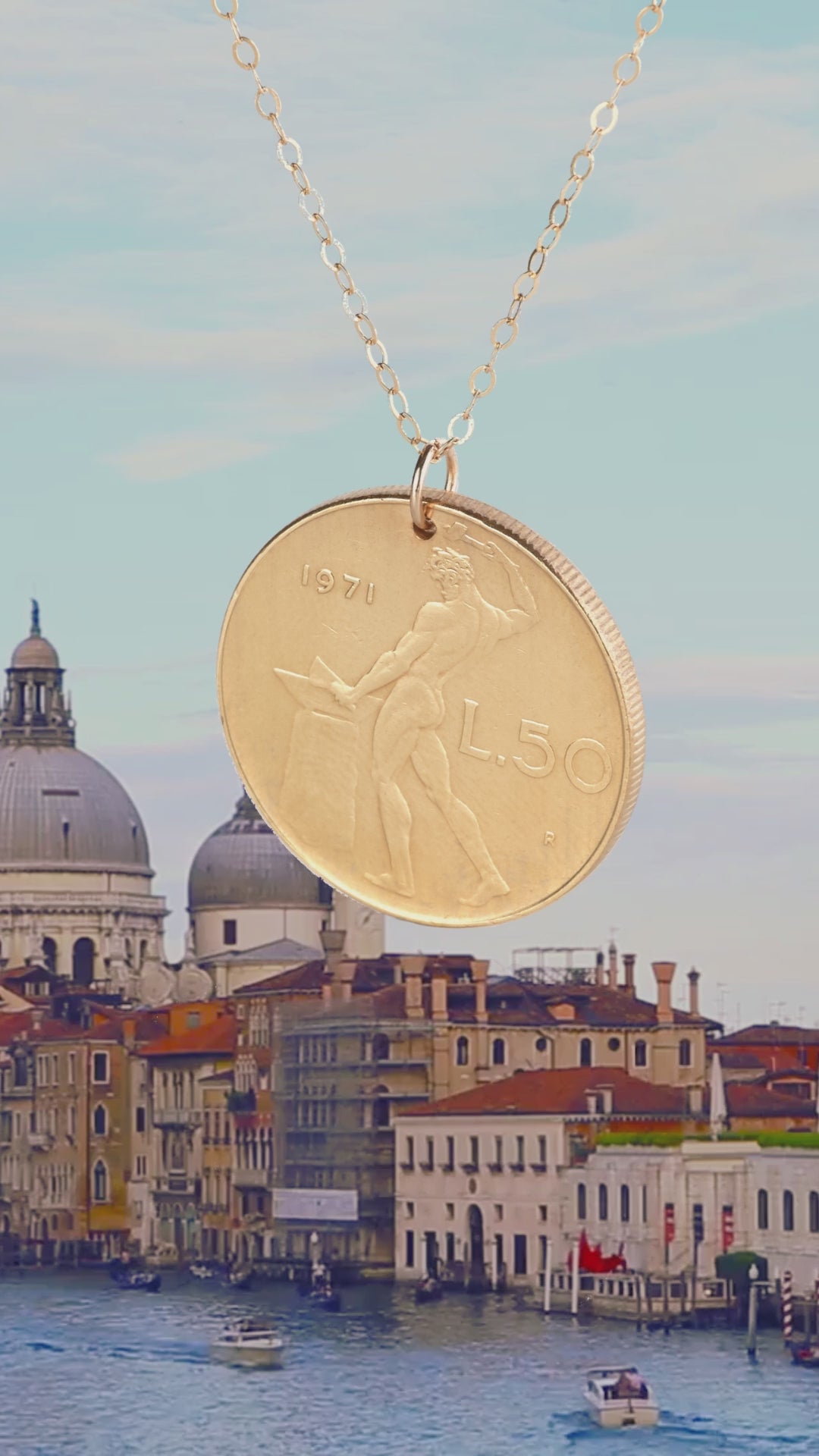 Each necklace is crafted from an authentic Italian coin, polished and plated in 18k gold for lasting brilliance. With coins no longer in circulation, every piece is a rare memento — carrying history, story, and timeless elegance.